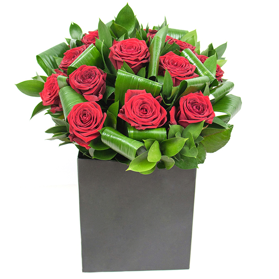 Enhance your living space with our beautiful red rose composition, featuring a stunning blend of vibrant red roses, lush aspidistra leaves, and delicate ruscus. This unique bouquet exudes elegance and style, making it a perfect addition to any home.
